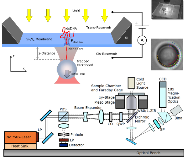We previously measured the translocation of dsDNA through 20 nm thick Si3N4 membranes (0.1 pN/mV for pores ≥ 30 nm) [2, 3]. Lipid coating as well as carbon nanomembranes and graphene with a thickness of 3 nm and 0.3 nm respectively allow for even more sensitive measurements.